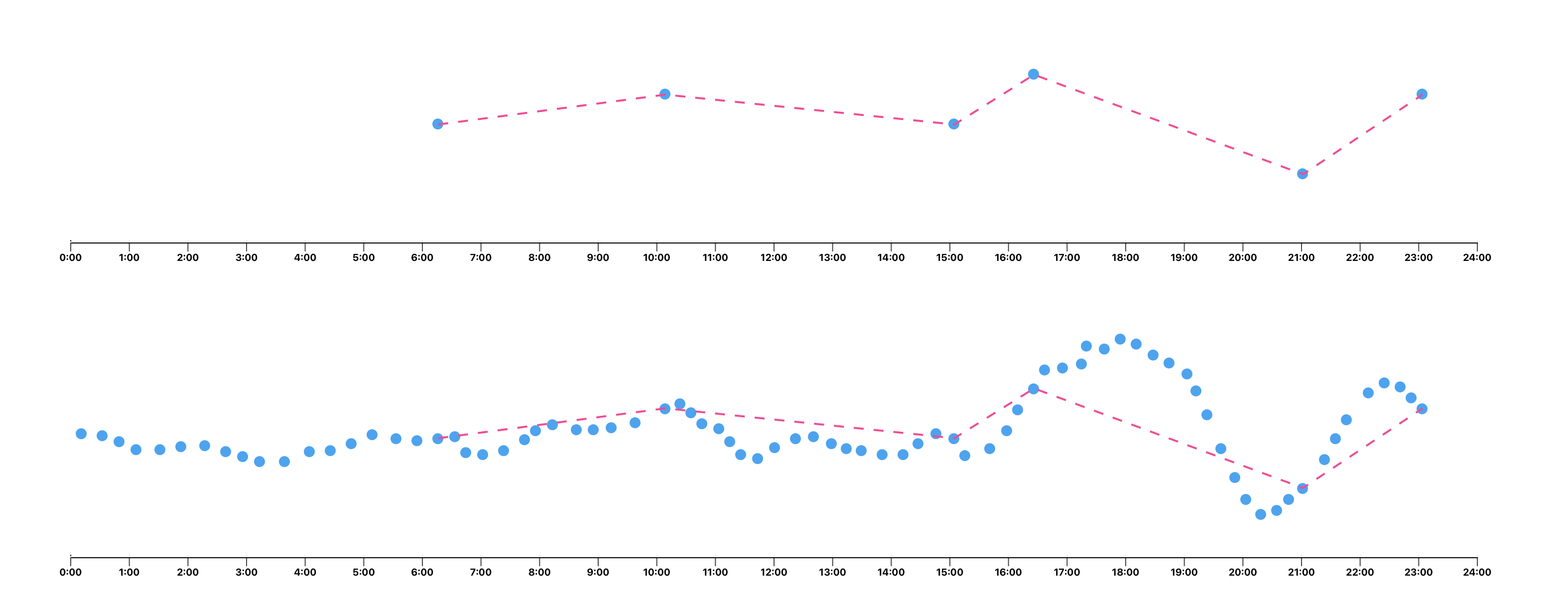 Think about this — with six data points of resolution, you have no clue as to the direction your blood glucose is travelling. If you're off to bed, take a finger-prick test, and see 6.0, that could mean that your blood glucose levels are perfect, that your glucose levels are dropping rapidly, or that your glucose levels are rising rapidly. The main innovation of the Libre is being able to easily determine the direction of your blood glucose at any moment in time.