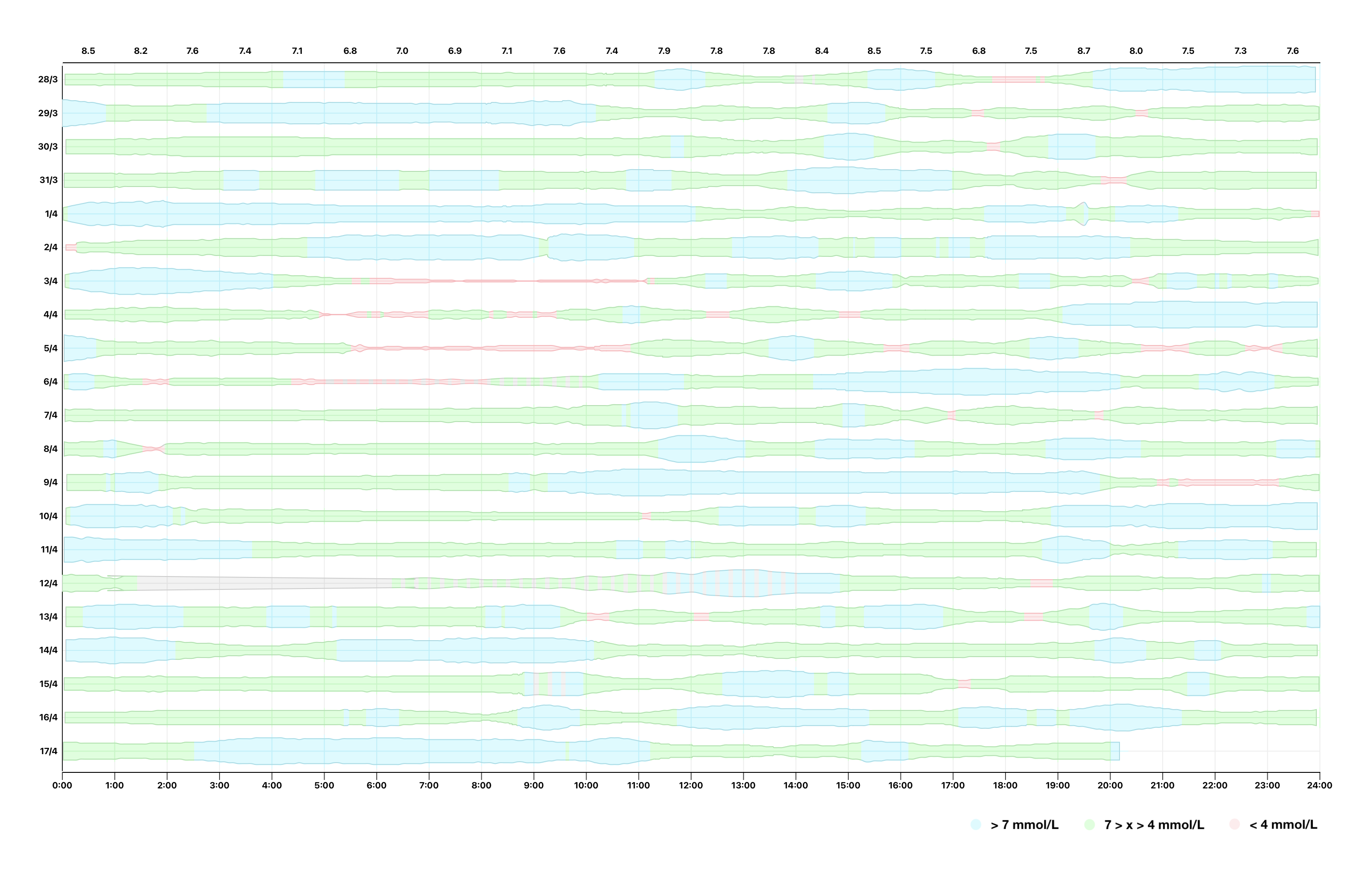 For example, here's a quick web-based visualization I made, showing my blood glucose levels for twenty-one days, rendered as a series of stacked violin plots using the visx library —